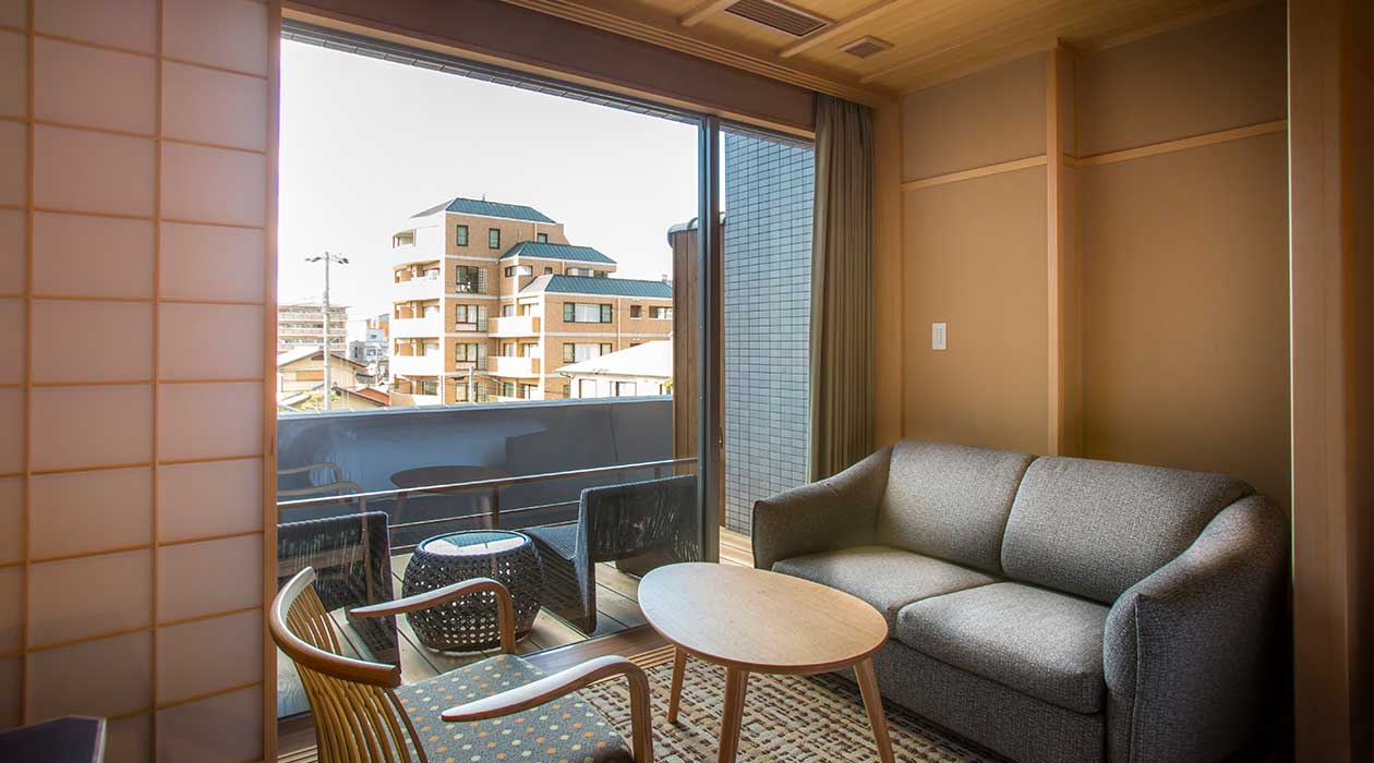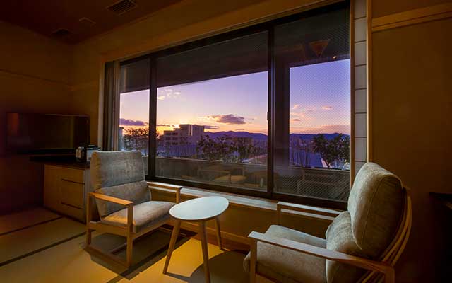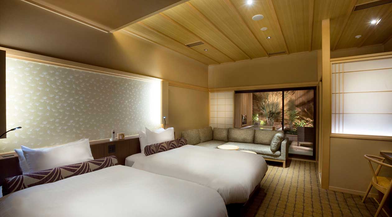 客房以白木家具作为装饰重点,使用天然素材将空间统一成自然的色调。全室共有散发日式温馨感的双床房38间。本酒店以日本文化的机能性为主,采用了可在客房内脱鞋进入,享受轻松悠闲度假时光的设计。还有可以感受日本风情的塌塌米空间,另外,确保入浴时可浸到肩部,特别配置了深度和高度适应的宽敞浴缸。多数客房设置了散发清爽木香与柔和肌肤触感的桧木浴缸。将京都伏见的地产酒注入浴池,尽情的享受具有美容、保暖保湿效显著的日本酒入浴之趣。本酒店为您精心的准备了可根据使用目的而选择的16间各种客房类型。例如:配备半露天浴池的房型,可欣赏茂叶见的缕缕阳光; 配备下挖式暖炉炕桌的房型,可安稳的休养身心;还有可在客房用餐的日式房型;配备眺望露台的房型,可愉悦地眺望京都街景;配备办公书桌的房型,方便商务等工作利用;另外,还有可容纳3~5人共同入住的客房类型等,您可依据入住目的与客房风格等任意选择入住。